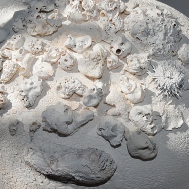 Use of different elements such as clay, porcelain, textiles, oxides, shells, engravings, and mixed materials, combined to explore texture, form, and organic expression.
